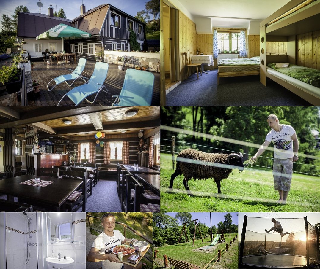 Ubytování: Penzion s rodinnou atmosférou, zrekonstruovaný v roce 2015. V penzionu je 36 lůžek ve 2- až 5-lůžkových pokojích. Tři pokoje mají vlastní soc. zařízení, v ostatních případech je vždy pro dva pokoje jedna společná koupelna. Společenská místnost (jídelna) s TV-SAT a videopřehrávačem. Bar s celodenním provozem. Možnost polopenze i plné penze, po vydání večeří i minutkových specialit (dle jídelního lístku). Bezplatné WiFi i parkování před penzionem. Slušní domácí mazlíčci vítáni. Možnost zapůjčení grilu. Nabízíme možnost odvozu k vleku či na nádraží. Penzion je vhodný pro rodiny s dětmi (k dispozici dětské židličky, postýlky, skluzavka, pískoviště apod.) i pro větší skupiny (např. školy v přírodě).