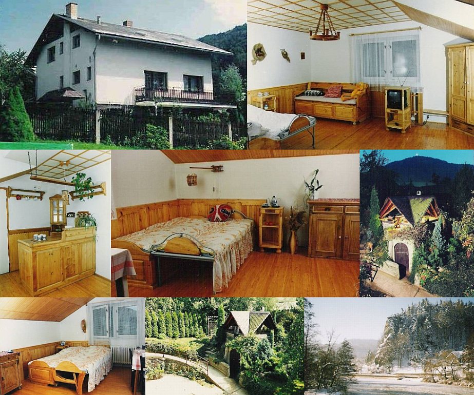 Ubytování: Vila se dvěma 2-lůžkovými pokoji, 3-lůžkovým pokojem a 6-lůžkovým apartmánem. Všechny pokoje i apartmán mají vlastní soc. zařízení (WC, sprcha), TV a kuchyňský kout (lednička, mikrovlnka, varná konvice, vařič, nádobí, talíře a příbory). Útulnost pokojům dodává originální provedení nábytku a doplňků z přírodního dřeva. U vily je udržovaná zahrada ve svahu s romantickým výhledem na skalní hrad Panteon, s místy k posezení a s otevřeným ohništěm. Součástí zahrady je plně funkční malá kovárna a venkovní krb. Ubytovatel se celý život věnoval tradičním řemeslům, je uměleckým kovářem, pracoval při obnově památek v Praze a na zakázkách pro Národní divadlo. Oblíbil si práci se dřevem. Ukázky z této praxe uvidíte v prostorách ubytování.