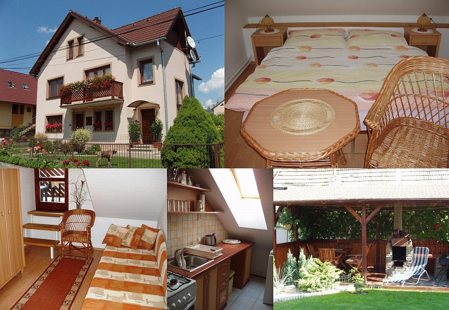 Ubytování: Apartmán pre max. 5 osôb v podkroví rodinného domu so samostantným vchodom. Tri izby (1x1 lôžko s krytou terasou, 2x2 lôžka), TV-SAT, jedálenský kút, plne vybavená kuchyňa, kúpeľňa so sprchovým kútom. WiFi pripojenie zdarma. Záhradný altán, parkovanie vo dvore, úschovňa bicyklov.