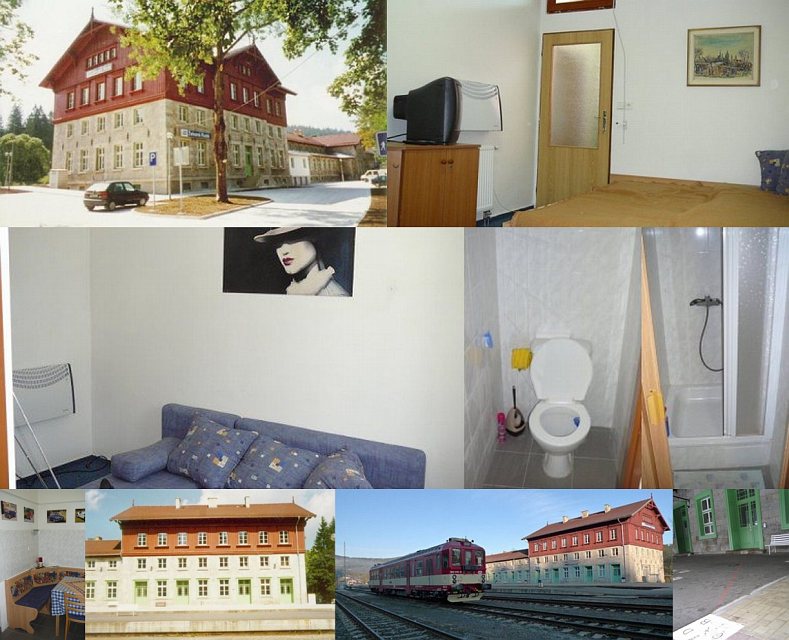 Ubytování: Apartmánový byt 2+1 v historické budově nádraží. V apartmánu je 6 lůžek, WC, sprcha, kuchyňský koutek (vařič, lednice, mikrovlnka, varná konvice, nádobí), TV+SAT. Návštěvníkům je k dispozici bezplatné parkoviště. Státní hranice prochází přímo středem budovy nádraží, kde je i muzeum.