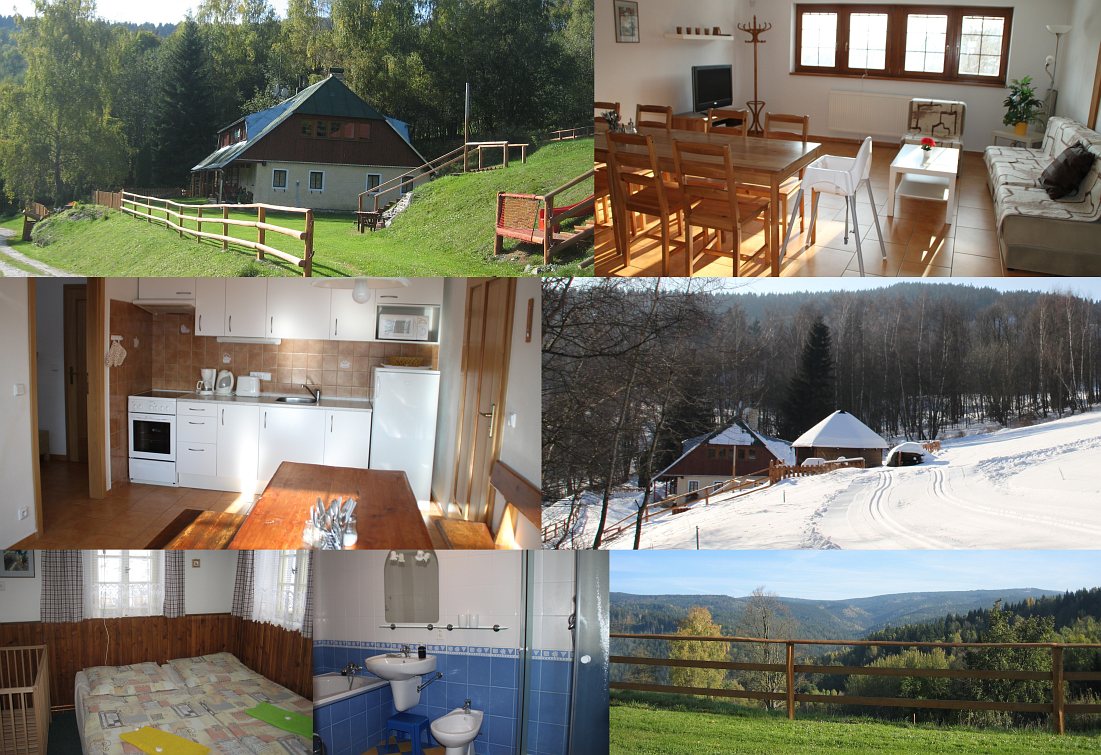 Ubytování: Chalupa se třemi apartmánovými byty 3+1 a 3+kk velikostí 45-90 m2. Každý byt má dvě 2-lůžkové ložnice, kuchyni (el. sporák s keramickou deskou a el. troubou, lednice, mikrovlnka, kávovar, rychlovarná konvice, toustovač, nerezové nádobí, jídelní stůl pro 8 osob), koupelnu (sprcha, umyvadlo, bidet), WC, obývací pokoj (možnost 4 přistýlek, TV+SAT). V celé chalupě je wifi. V přízemí je místnost pro ukládání lyží a kol, pračka. Ubytování s domácím zvířetem po dohodě. Před chalupou je posezení v zastřešené kolibě s rožništěm, ohniště. Dětský koutek na pozemku i uvnitř chalupy.