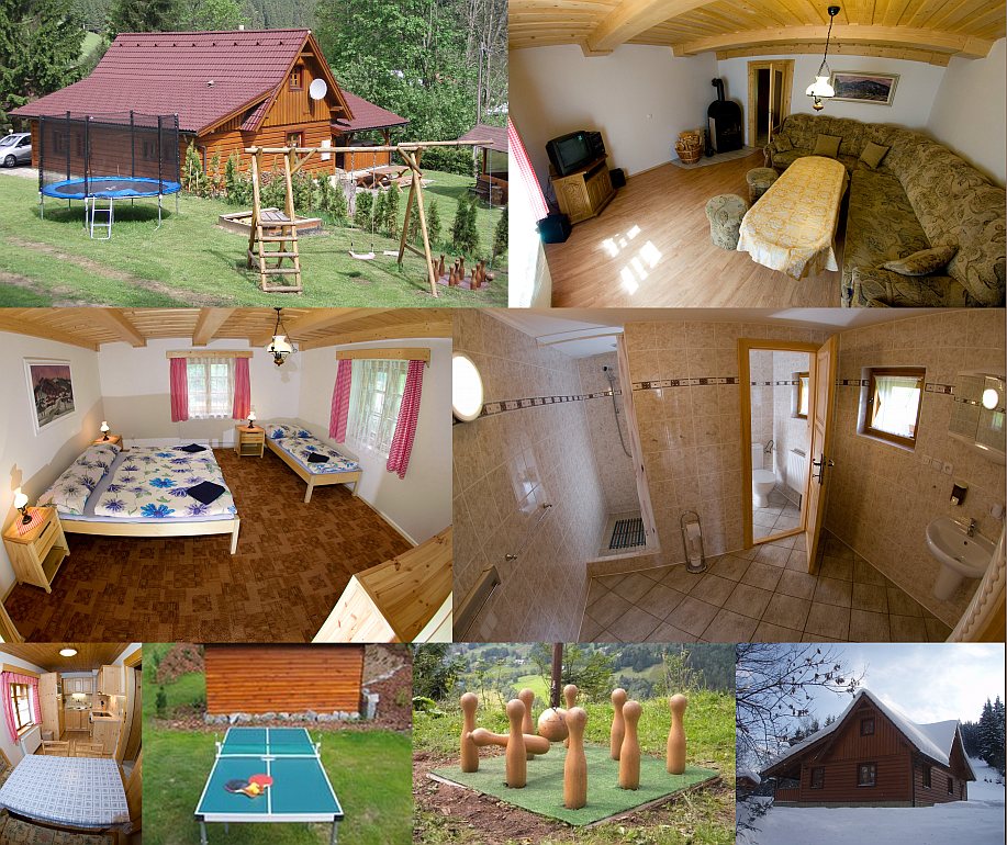 Ubytování: Chalupa s kapacitou 11 osob. V chalupě jsou 4 ložnice, koupelna se sprchovým koutem, 2 WC, kuchyň (nádobí, rychlovarná deska, mikrovlnka, myčka na nádobí, lednice), jídelna, obývací pokoj (krb, TV, DVD, rádio), terasa s vířivou vanou, elektronické šipky. Venku je gril na dřevěné uhlí, dětské hřiště s pískovištěm, badminton, stolní tenis.