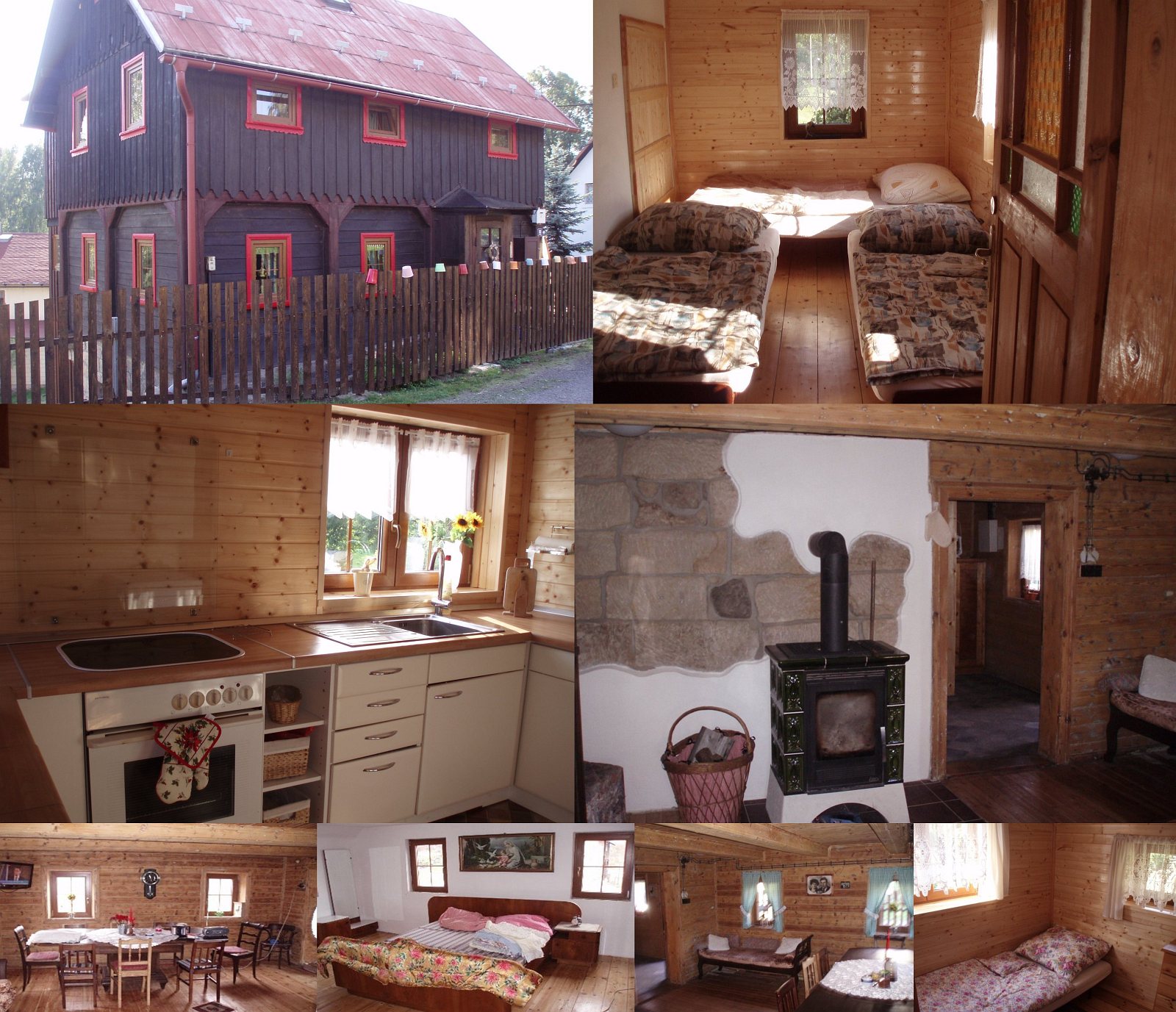 Ubytování: Chalupa pro 9 osob ve 3 ložnicích, s celoročním provozem. V přízemí je obývací pokoj s televizí, vybavená kuchyně (s ledničkou, mikrovlnkou, varnou konvicí, myčkou nádobí a sklokeramickou deskou), koupelna s WC a sprchovým koutem. V patře jsou tři ložnice (1x2, 1x3 a 1x4 lůžka) a další WC. Na zahradě před chalupou je možnost posezení (zahradní nábytek, slunečník) i parkování pro 3 auta. Vytápění krbovými kamny v obývacím pokoji, ohřev teplé vody elektrickým bojlerem.