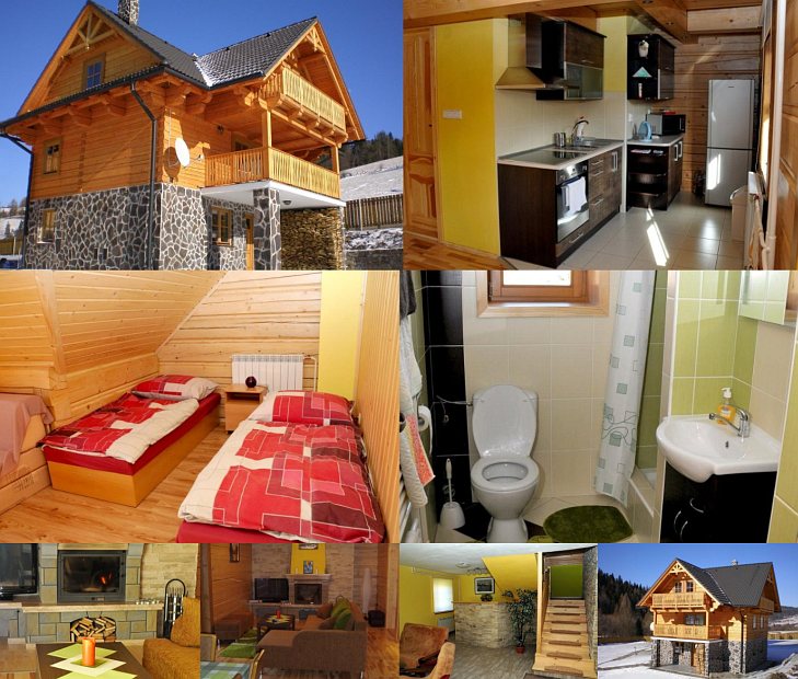 Ubytování: Chata s 5 izbami celkom pre 15 osôb. Izby 4x 2-lôžková, 1x 3-lôžková, možnosť celkom 4 prístelok. Dve spoločné kúpelne (umývadlo, sprchovací kút/vaňa, WC), kuchynská linka (sklokeramická varná doska, elektrická rúra, chladnička, mikrovlnka, rýchlovarná kanvica). Dve spoločenské miestnosti (prvá má barový pult, druhá krb, posedenie, TV+SAT, jedálenský stol). Veľká terasa s posedením. V chate je zákaz fajčenia. V prípade väčšieho počtu záujemcov možnosť ubytovania v ďalších dvoch chatách.