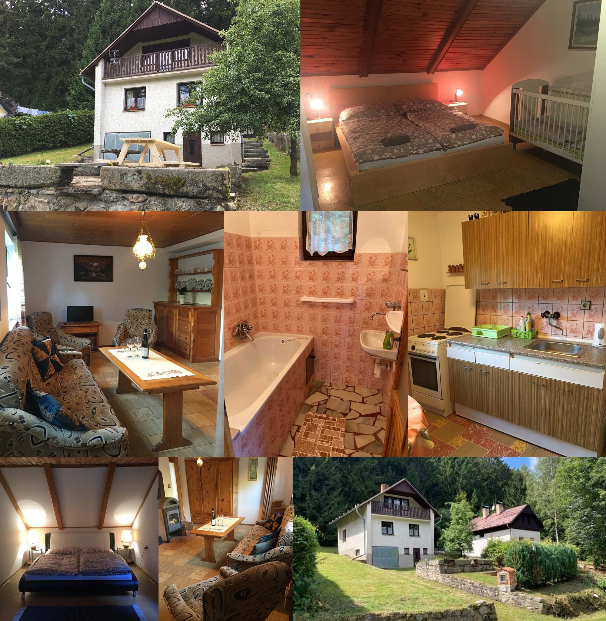 Ubytování: Rekreační chata max. pro 6 osob, ideální pro pobyt rodin s dětmi. V přízemí chaty je obývací pokoj s příjemným posezením u krbu, plně vybavená kuchyň (lednička, el. sporák s troubou, mikrovlnka atd.) a koupelna s toaletou. V patře jsou 2 ložnice (v menší je manželská postel s dětskou postýlkou, ve druhé je manželská postel a 2 oddělené postele). Před chatou je travnatý pozemek, venkovní pergola s posezením, ohniště, gril i možnost parkování. Garáž vhodná pro úschovu kol a lyží.