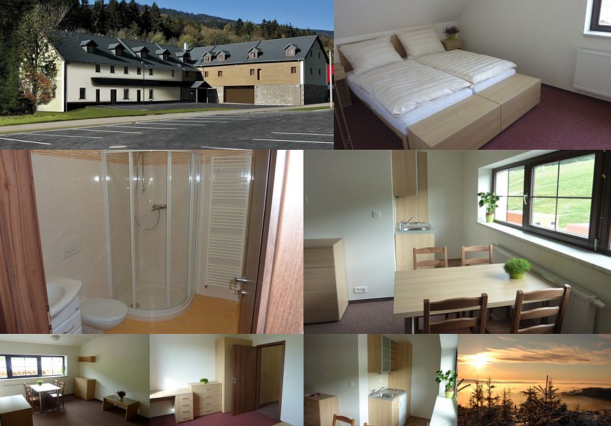 Ubytování: Nově postavená chata (v provozu od 1.12.2011) s 3- až 6-lůžkovými apartmány (9x3, 6x4, 1x5, 1x6 lůžek). Apartmány mají vlastní plně vybavený kuchyňský kout (lednice, sklokeramická varná deska, rychlovarná konvice) a nástěnnou TV+SAT v obývací části. Ke každému apartmánu náleží samostatná vyhřívaná skříňka na lyžařskou výstroj. V chatě je prostorná jídelna (možnost stravování, slouží i jako přednáškový sál - dataprojektor, plátno, internet). Chata je vhodná pro sportovní oddíly, lyžařské kurzy, školní výlety a další akce. Parkoviště u chaty.