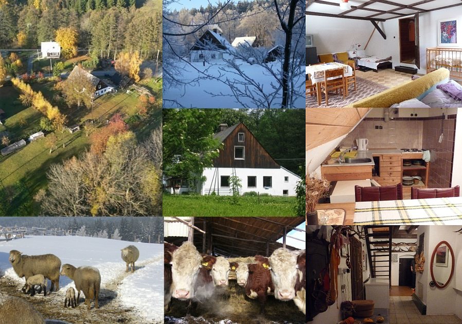 Ubytování: Apartmán v podkroví typického 120 let starého jesenického domu. V apartmánu jsou dva 2-lůžkové pokoje (jeden se 2 přistýlkami), koupelna se sprchovým koutem a vybavená kuchyňka. Ve velkém pokoji je TV + video a dětská postýlka. Venkovní posezení s ohništěm, pískoviště, houpačka, bezpečný potok. Ekofarma obhospodařuje louky (kvalitní seno). U sousedů možné koupit mléko a domácí tvaroh, na podzim med a jablka, možnost práce na farmě, jízdy na koni, půjčování sportovních potřeb, sběr léčivých rostlin, praní prádla, převoz hostů a zavazadel.