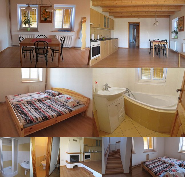 Ubytování: Ubytování v soukromí s kapacitou 15 lůžek v 5 pokojích. V přízemí je jeden 2-lůžkový pokoj s vlastní koupelnou. Na patře jsou dva 5-lůžkové pokoje se společným soc. zařízením. Všechny pokoje mají možnost přistýlky. Pokoje mají kvalitní postele a lůžkoviny, menší odkládací prostor. V přízemí je vybavená prostorná obývací kuchyň (sporák, lednice, mikrovlnka, varná konvice, nádobí) s terasou. K dispozici je TV a připojení k internetu. Parkování aut (i nákladních) přímo u penzionu na uzavřeném dvoře. Ubytování je vhodné pro firmy, větší skupiny i jednotlivce.