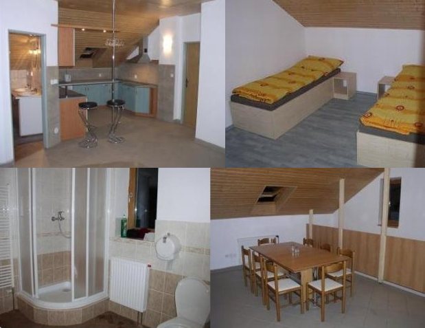 Ubytování: Penzion s kapacitou 24 osob ve 3 apartmánech. V každém apartmánu je vlastní kuchyňský kout (sporák, lednice, myčka nádobí, mikrovlnka, rychlovarná konvice, nádobí), soc. zařízení (WC + sprchový kout) a možnost připojení k Internetu. První apartmán má 3 pokoje s celkovou kapacitou 10 lůžek (2+3+5 lůžek) + případně 2 přistýlky. Druhý apartmán má 3 pokoje s kapacitou 10 lůžek (3+3+4). Třetí apartmán má 1 pokoj se 4 lůžky.