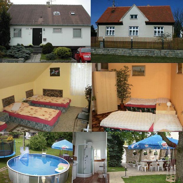 Ubytování: Penzion a chalupa se společnou zahradou. Možnost zapůjčení notebooku, horských kol. Na zahradě posezení s grilem, bazén (průměr 5,5 m, solární ohřev), trampolína, ruské kuželky, el. šipky, ping-pong, softtenis, badminton, pískoviště, prolézačka, houpačka. Parkování u domu. Wifi. Penzion: ubytování v soukromí v podkroví rodinného domu (dva 2-lůžkové pokoje se soc. zařízením a dva 2-lůžkové pokoje se společným soc. zařízením, možnost přistýlky), společná kuchyň (vařič, kávovar, mikrovlnka, lednice), spol. místnost (možnost zapůjčení TV). Chalupa (10 lůžek): 3 ložnice, zařízená kuchyň (lednice, rádio, mikrovlnka, kávovar, pračka), 2 koupelny s WC, 3 TV, topení (kachlová kamna a el. přímotopy).