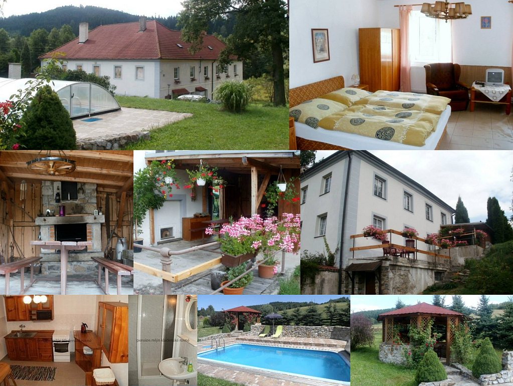 Ubytování: Penzion v romantickém prostředí zrekonstruovaného mlýnského stavení z 16. století. Penzion má kapacitu 18 lůžek ve 2- až 4-lůžkových pokojích s možností přistýlky. Dva pokoje jsou bezbariérové. Každý pokoj má vlastní sociální zařízení a varnou konvici. Na každém patře je lednice. Společná je kuchyň (sporák, mikrovlnka, varná konvice, toustovač, nádobí), terasa, venkovní krb, zastřešený bazén, trampolína, stolní tenis, místnost pro úschovu kol. V penzionu je wifi. Možnost zapůjčení dětské postýlky. Možnost ubytování s domácím mazlíčkem. Možnost snídaní.