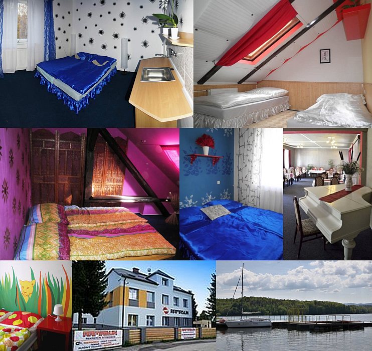Ubytování: Penzion s pokoji v orientálním stylu, s partnerskými motivy i pro rodiny s dětmi. V penzionu je 15 pokojů (2x1, 10x2, 1x3, 2x6 lůžek). Každý pokoj je originálně zařízen studenty fakulty umění Ostravské univerzity. Pokoje mají vlastní soc. zařízení a wifi. V areálu je restaurace (možnost penze), bufet, altánek pro venkovní posezení, ohniště, krb, hřiště pro míčové hry, venkovní dětský koutek, úschovna kol a lyží, stolní tenis, parkoviště a molo. Možnost pronájmu plachetnice, motorového člunu a využití soukromé tiché pláže. Penzion je vhodný pro pobyty rodin, párů, školy v přírodě, rodinné oslavy, školení i soustředění sportovců.