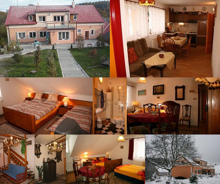 Ubytování: Penzion rodinného charakteru s celoročním provozem. 9 pokojů či apartmánů (5x2, 2x3, 2x4 lůžka, možnost 6 přistýlek), 5x koupelna (max. 2 pokoje sdílí společnou koupelnu). Společenská místnost s TV a kuchyňka. Apartmány mají kuchyňku vlastní, jeden navíc i terasu. Parkování v areálu penzionu i v garáži. Zapůjčení sportovního nářadí, kol, přístup k internetu. Hosty bez auta bezplatně přivezeme i odvezeme od vlaku či autobusu. Možnost stanování na přilehlém pozemku u nedalekého rybníka.