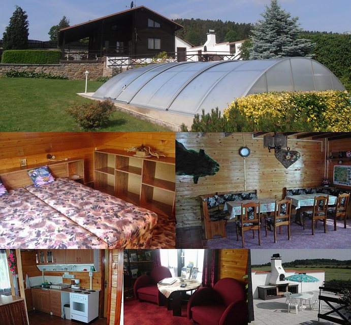 Ubytování: Chata s 12 lůžky, celá k dispozici jen klientům, včetně zahrady s okrasnými keři a zastřešeného bazénu. Kompletně vybavená kuchyň (el. sporák, mikrovlnka, lednice s mrazničkou, rychlovarná konvice, kávovar, toustovač), velká jídelna s TV+SAT. Krytá terasa se zahr. nábytkem, houpačkou a koupelnou s WC. Velká ložnice se 4 lůžky, koupelna a WC. Ve sníženém podkroví 2 ložnice (2+4 lůžka) a spol. místnost (TV+SAT, DVD, radiomagnetofon+CD). Otevřená terasa s krbem a udírnou. Dětská postýlka, chodítko, stoleček, vanička. Bazén je v provozu v měsících 05-09.