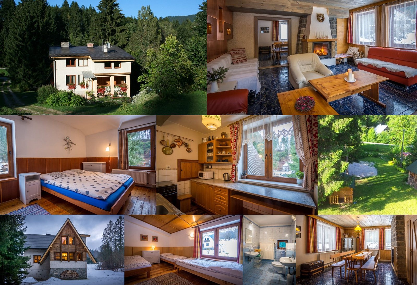 Ubytování: Dobre vybavená rekreačná chata pre 15 osôb, vhodná pre rodinky s deťmi alebo skupinky turistov. V chate je 5 spální (3x2, 1x3, 1x4 lôžka, možnosť 2 prísteliek), rozľahlá spoločenská miestnosť s krbom, SAT-TV a CD, jedáleň, plne zariadená kuchyňa (mikrovlnka, sporák, rúra, rýchlovarná kanvica, chladnička) a kúpelne na prízemí aj na poschodí (sprchy, WC). Pred chatou je záhrada, vonkajšie posedenie, ohnisko, gril, detský domček a možnosť parkovania.