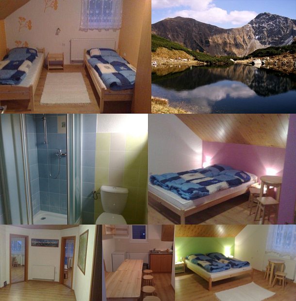 Ubytování: Nový rodinný dom s 2- a 3-lôžkovými izbami, na samostatnom podlaží. Rozdelenie izieb: 1x2-lôžková izba se soc. zariadením, 1x3-lôžková izba se soc. zariadením a balkónom, 1x2-lôžková izba, 1x3-lôžková izba s balkónom (pre posledné dve je spoločné soc. zariadenie). Spoločná kuchyňa, spoločenská miestnosť.