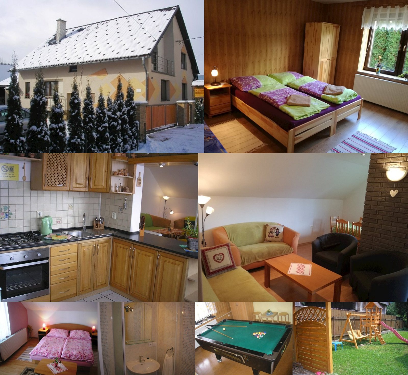 Ubytování: Útulne zariadená chalupa pre 17 osôb, s rozľahlou záhradou. Majiteľ v objekte nebýva, súkromie zaručené. V chalupe sa nachádza 5 farebne zariadených spální (1x2, 2x3, 2x4 lôžka, na niektorých je TV), 4 kúpelne (so sprchou, umývadlom a WC), rozľahlá spoločenská miestnosť (stolovanie, sedacia súprava, TV/SAT), 2 plne vybavené kuchyne (s chladničkou, mikrovlnkou, kanvicou, sporákom a el. rúrou), miestnosť s biliardom. Pre rodiny s deťmi: detská stolička na kŕmenie a postieľka. WiFi pripojenie grátis v celej chalupe. Záhrada s altánkom, záhradným grilom a ohniskom. Detský domček so šmýkalkou, hojdačkou a veľkou TRAMPOLÍNOU. Uzatvorené parkovanie vo dvore pre 6 áut.