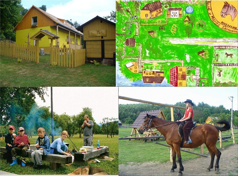 Ubytování: Stanovanie, opekanie, grilovanie, guláš partie, občerstvenie, ochutnávka farmárskych výrobkov, týždenné letné tábory pre vaše deti (max. 10), jazdy na koňoch aj poníkoch, prechádzky prírodou, zber lesných plodov a hríbov, ustajnenie koní. V areáli detské ihrisko s hojdačkami, ohnisko, mini ZOO (kone, poníky, lama, daniele, pštrosy, ovce, teliatka).