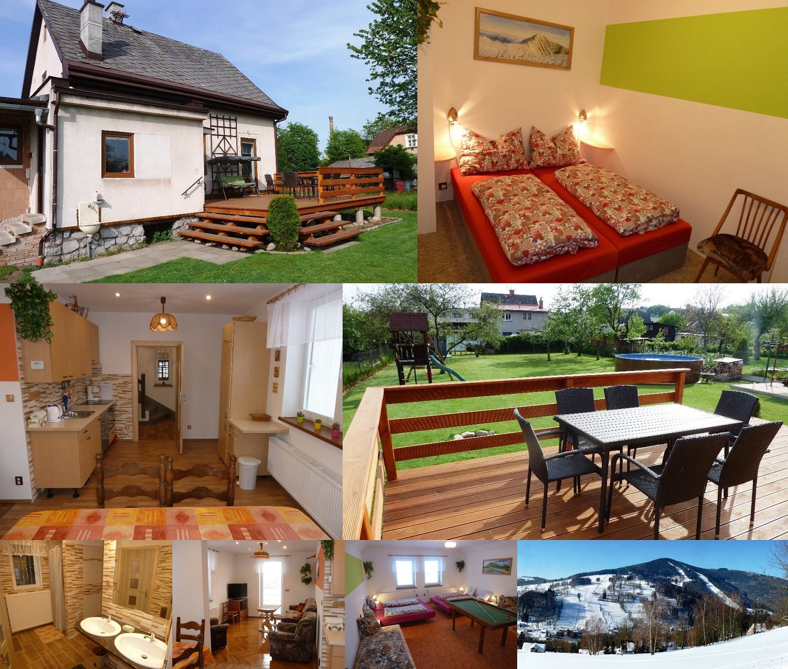Ubytování: Nově zrekonstruovaný rodinný domek max. pro 10 osob, s vlastní velkou zahradou. V přízemí je vstupní hala, kompletně vybavená kuchyně (myčka, lednice, mikrovlnka, trouba, kávovar, stůl pro 6 osob), obývací místnost (posezení, TV, rádio, vstup na terasu se zahradním nábytkem), ložnice (2 lůžka), koupelna, WC a sklípek. V patře je chodba s gaučem, společná ložnice pro 6 osob, kulečník. WiFi zdarma. Na zahradě je v létě trampolína (3 m), bazén (průměr 4,6 m), dětské hřiště s pískovištěm a klouzačkou, ohniště, gril. Kola a lyže možno odkládat v kůlně. Centrální vytápění elektrokotlem, ohřev užitkové vody el. bojlerem. Parkování přímo u domu na vlastním pozemku.