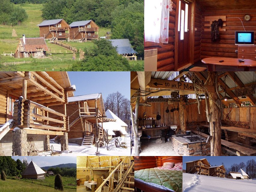 Ubytování: Dva dřevěné domy s celkem 4 apartmány (jeden vždy v přízemí, druhý v patře). V každém apartmánu je obývací pokoj (rozkládací sedací souprava, TV-SAT), ložnice (dvoulůžko), koupelna (sprchový kout, WC) a balkon s nádherným výhledem do krajiny. K penzionu patří koliba (možnost stravování, zakarpatská, slovenská i maďarská kuchyně) a sauna. Majitelé umí dobře česky.
