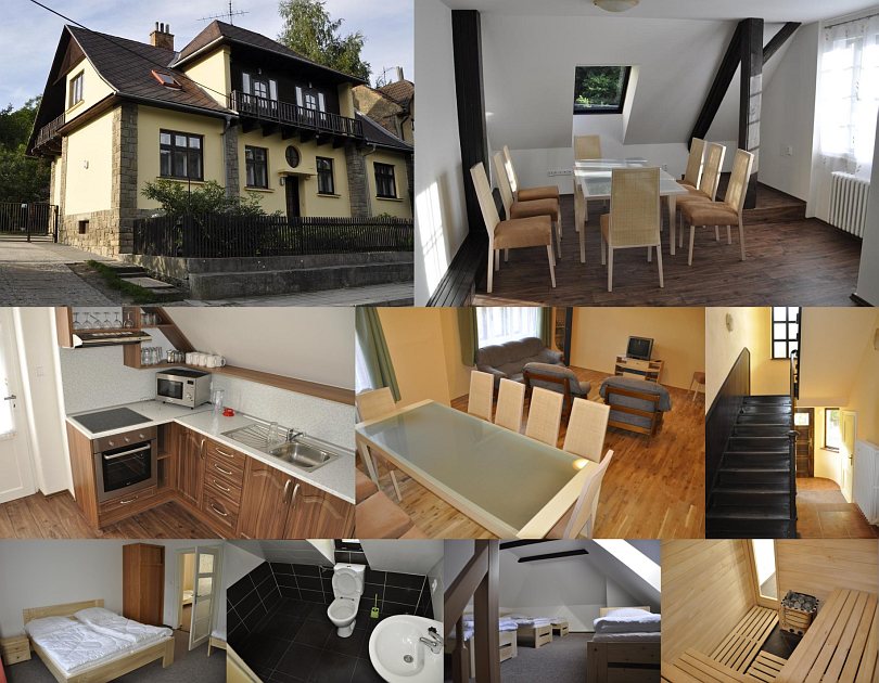 Ubytování: Zrekonstruovaná chalupa se zachovaným rázem. Přízemí: 2- a 3-lůžkový pokoj, spol. místnost (kabelová TV, DVD), kuchyň (el. sporák s troubou, mikrovlnka, varná konvice, toustovač, topinkovač, lednice, mrazák), koupelna, WC, lyžárna. Patro: dva 2-lůžkové pokoje, 5-lůžkový pokoj s TV, 2x koupelna, kuchyň (lednice, mrazák, el. varná deska, mikrovlnka, varná konvice, remoska, toustovač), jídelna (kabelová TV, DVD). V chalupě je sauna (8 osob), masážní bazén (6 osob), venkovní terasa (gril, udírna, plastový nábytek), zahradní posezení, pískoviště, el. šipky, wifi, elektronické zabezpečení, úschovna kol a lyží, uzamykatelné parkoviště.
