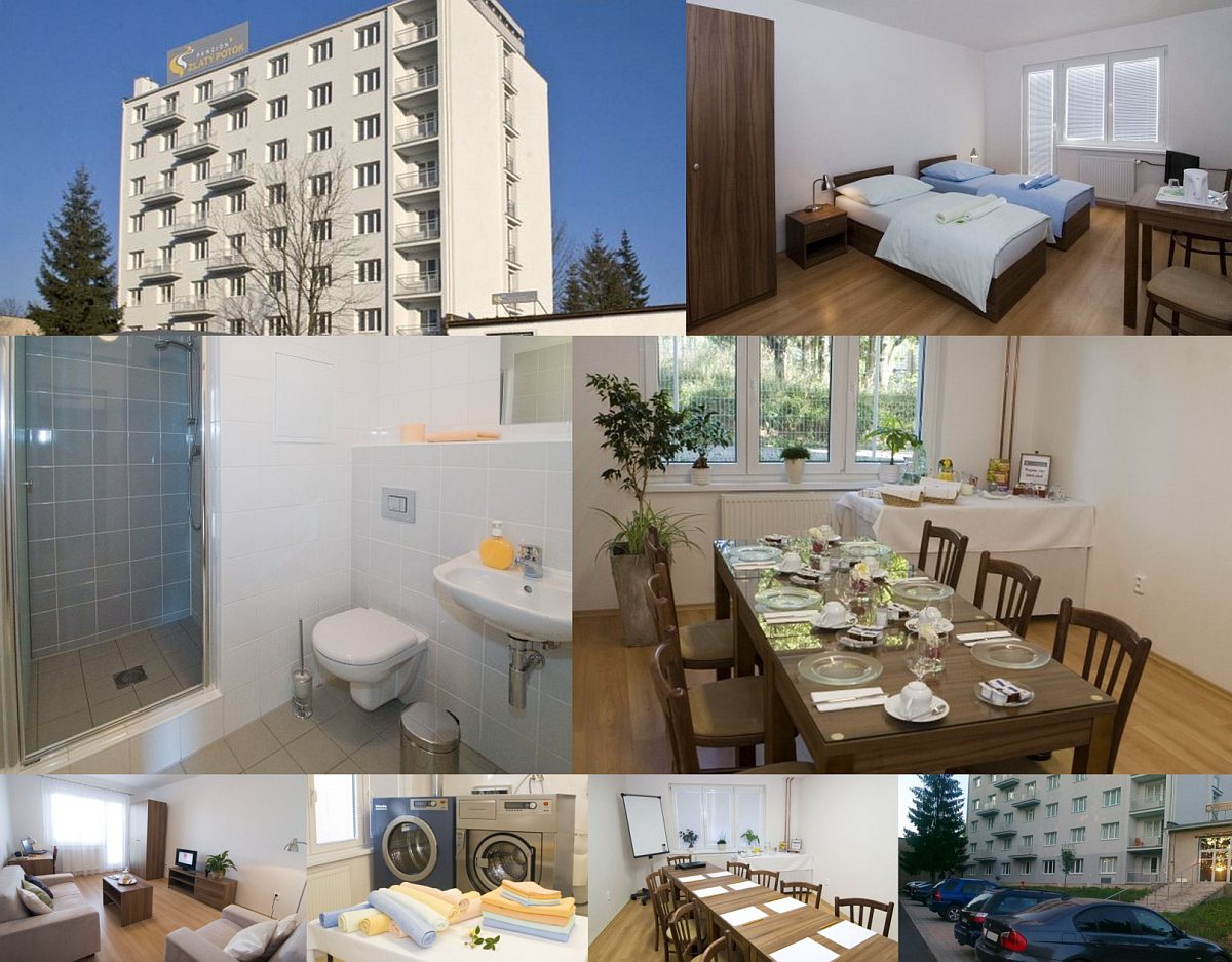 Ubytování: Zariadenie hotelového typu (penzión) s vysokým štandardom. Uzavretý areál v tichom prírodnom prostredí s monitorovaným parkoviskom. Ubytovanie v 1- a 2-lôžkových apartmánoch a izbách s vlastným hygienickým zariadením so sprchovacím kútom, umývadlom a WC. K dispozícii je aj komplex dvoch izeb pre 3 osoby (izby 1x1 a 1x2 lôžka, izby majú spoločnú predsieň a soc. zariadenie) a komplex dvoch izieb pre 4 osoby (2x2 lôžka, spoločná predsieň a soc. zariadenie). Hosť má k dispozícii bezplatné pripojenie na internet, rýchlovarnú kanvicu a LCD TV. Nepretržitá prevádzka. Raňajky podľa objednávky. Recepcia zabezpečuje na základe požiadavky hosťa obedy a večere donáškovou službou.